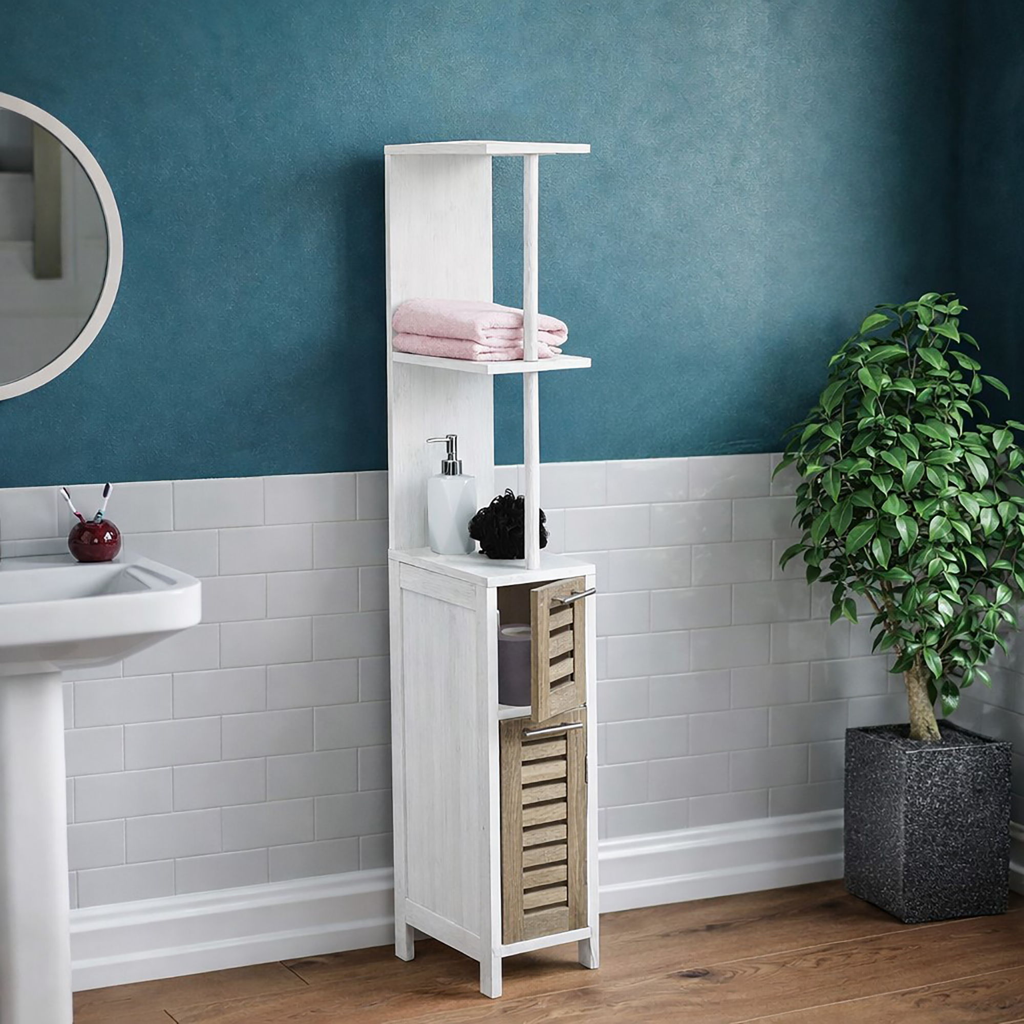 - BATHROOM TOWER: Conveniently store towels and daily essentials on two open shelves, keeping everything within reach. The cabinet’s dual-door design allows for discreet storage of personal items, giving your bathroom a tidy look