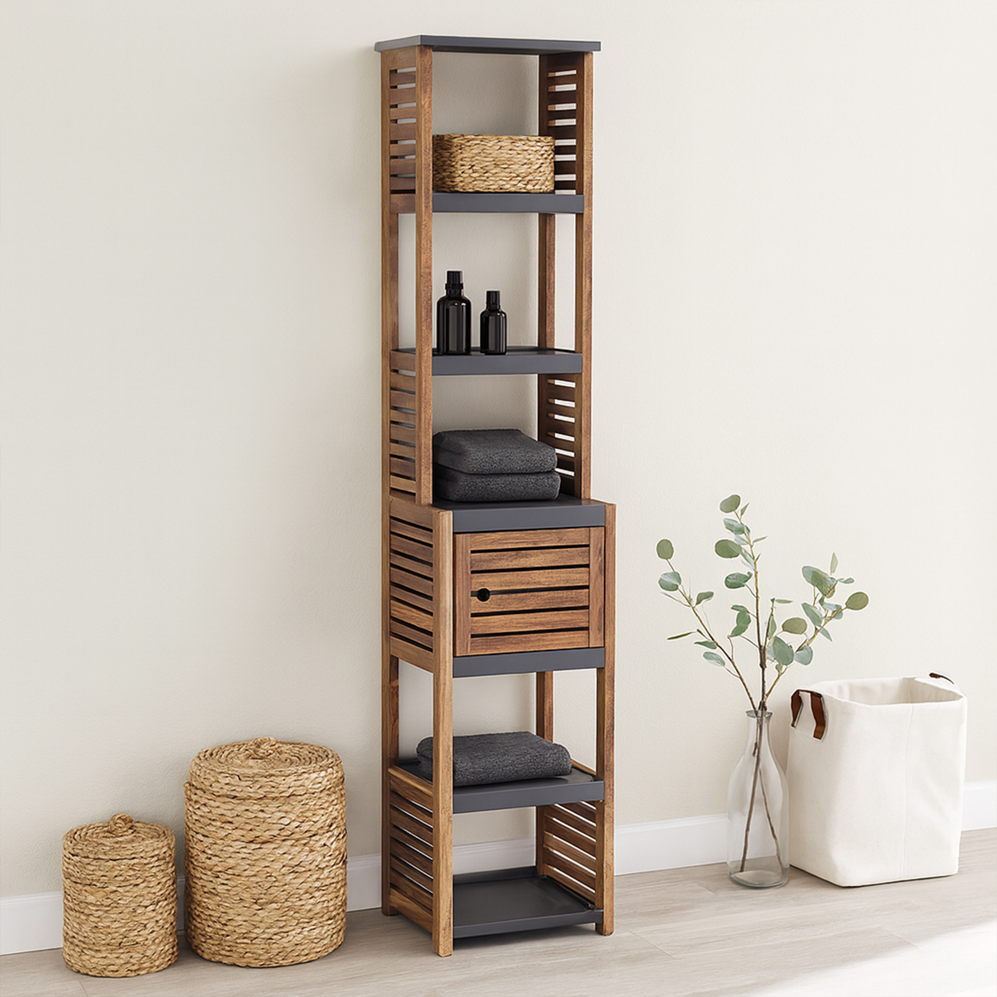 Featuring a durable MDF and acacia construction, our brown and gray storage cabinet complements any decor, from contemporary to rustic. Moreover, its compact, tall structure is designed for narrow spaces, making this towel cabinet a practical storage solution for bathrooms of all sizes.