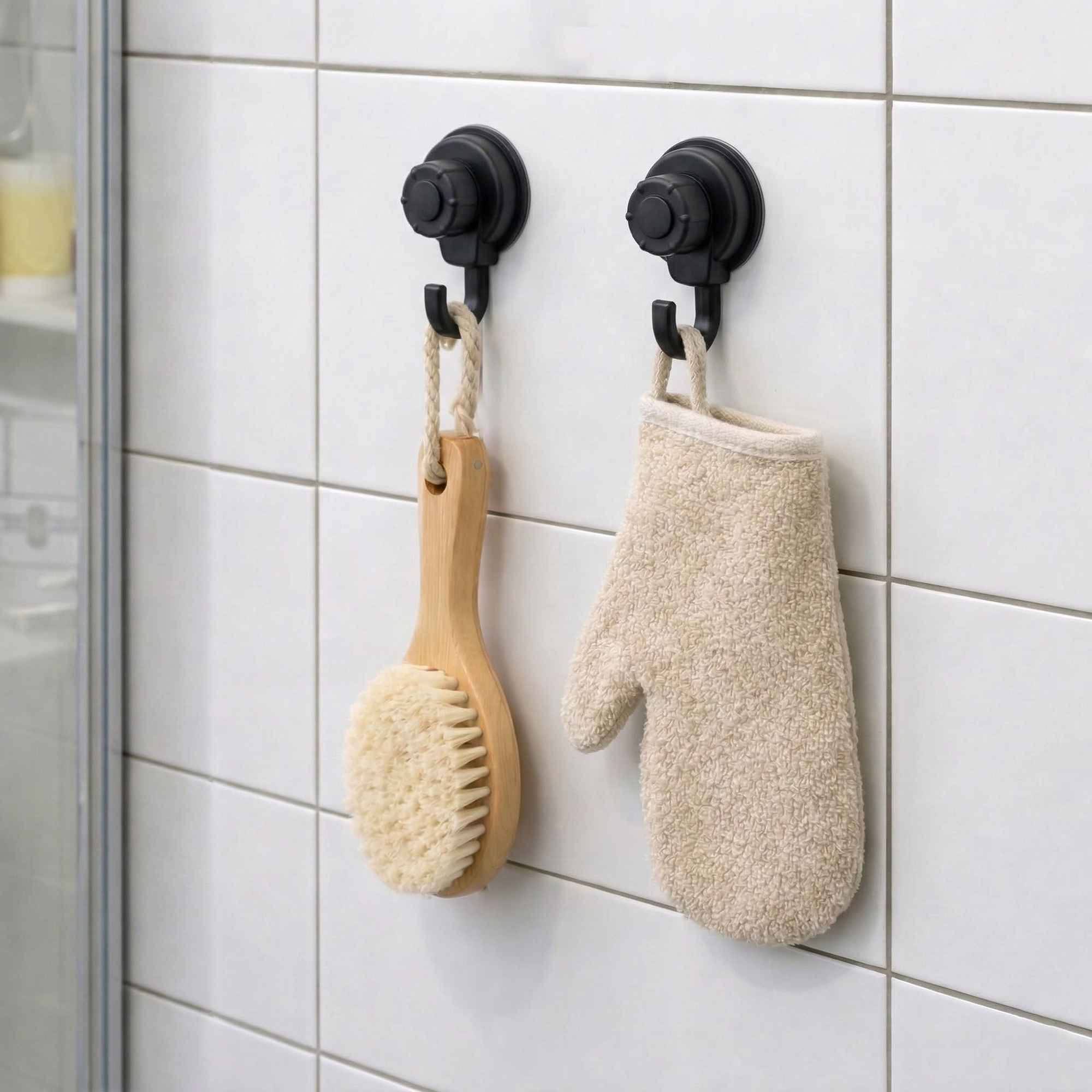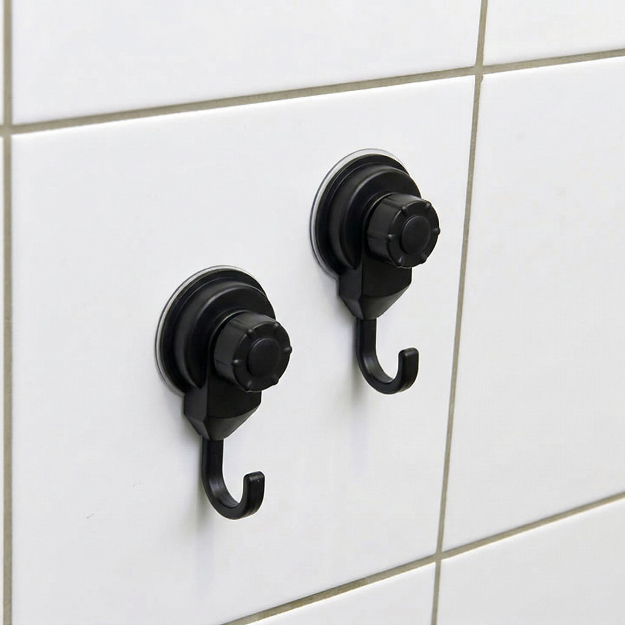 Strong Hold Vacuum Suction Cup Hooks Shower-Kitchen Walls Organizer Loofah Set of 2 Black