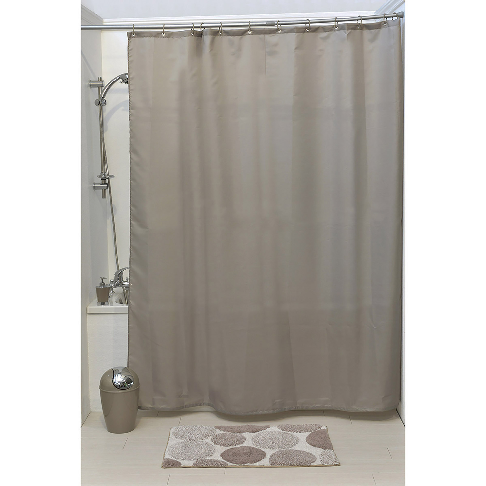 This decorative taupe extra long polyester 12 matching rings shower curtain comes with dimensions of 79L x 71W (200 x 180cm). So easy to add more character to your bathroom! Imported from France, Made in China