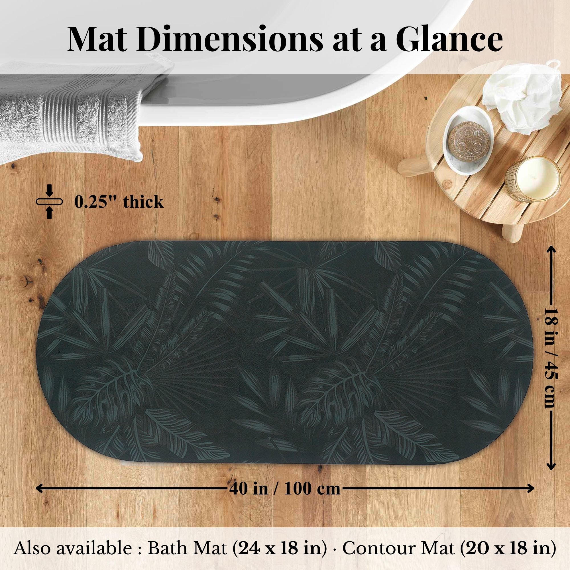 The Tropical Night Runner Bath Mat measures 40 x 18 inches — purpose-built to span bathtub fronts, double vanities, or wide shower entries. At 0.25 inches thick, it lies flat and secure without creating a tripping hazard.