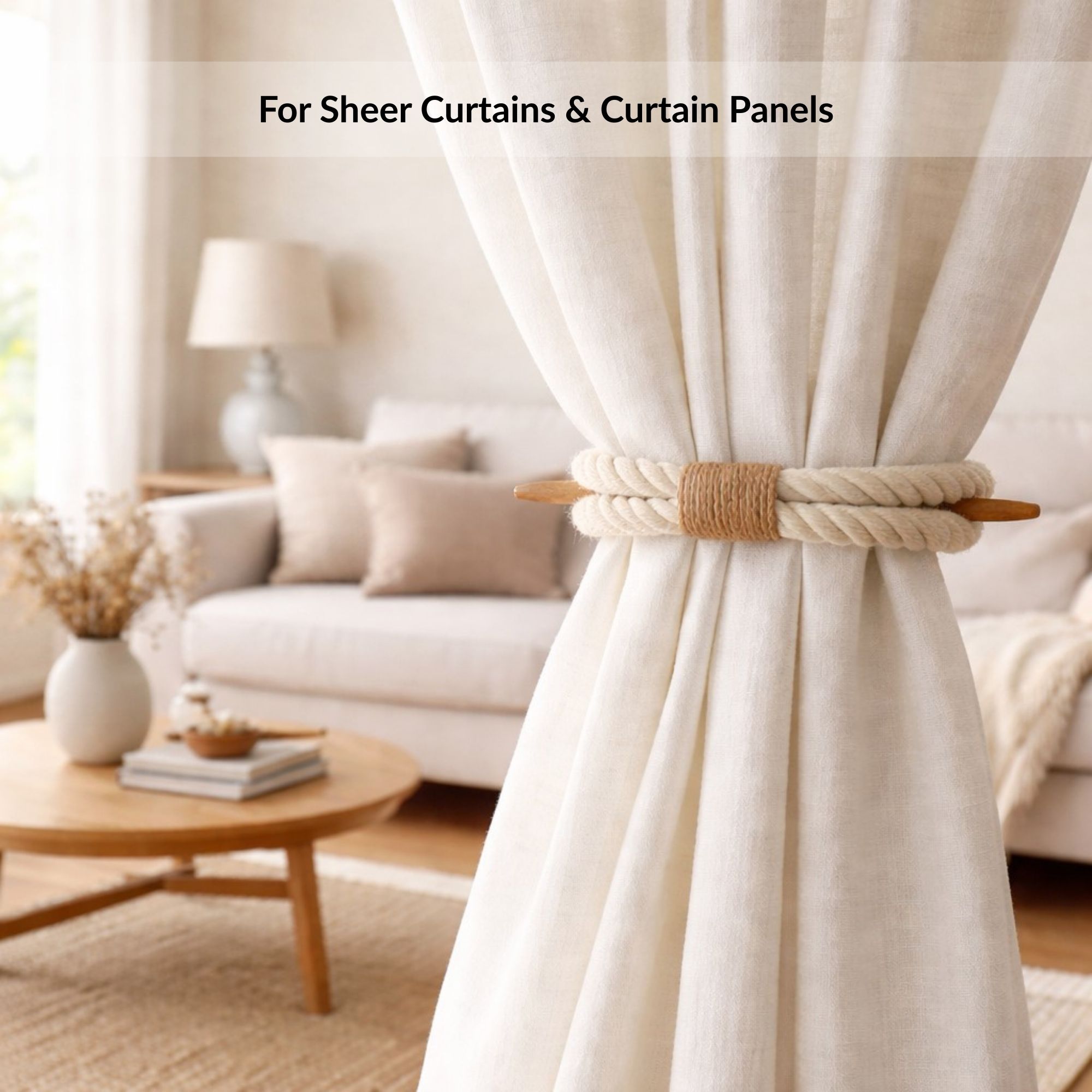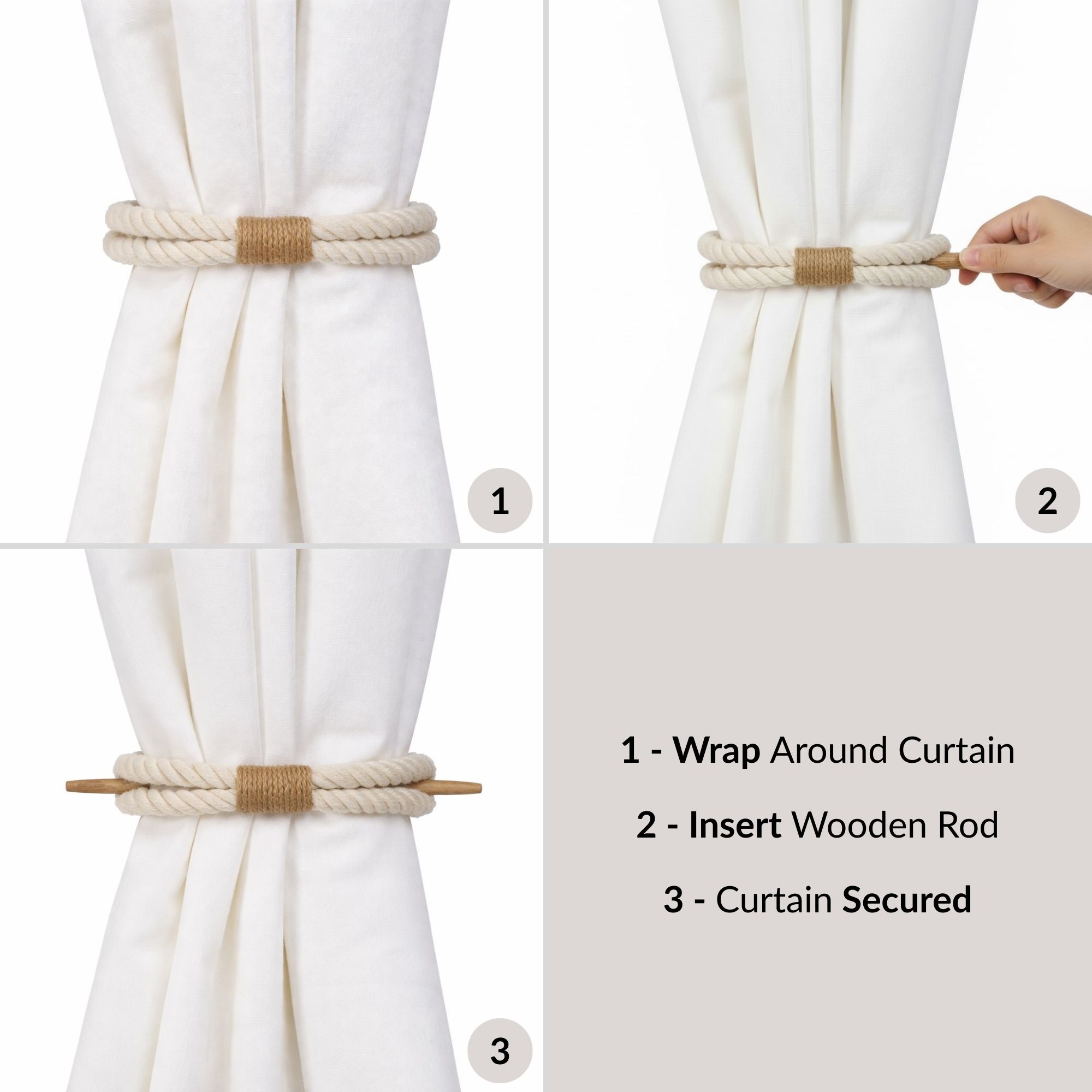 Designed with a wrap-around cotton rope and wooden stick, it allows you to style your curtains neatly while keeping installation effortless. First, wrap the cotton rope around the curtain panel at the desired height. Next, slide the wooden rod through the loop to hold the fabric in place. As a result, the curtain stays secured while remaining easy to adjust throughout the day.