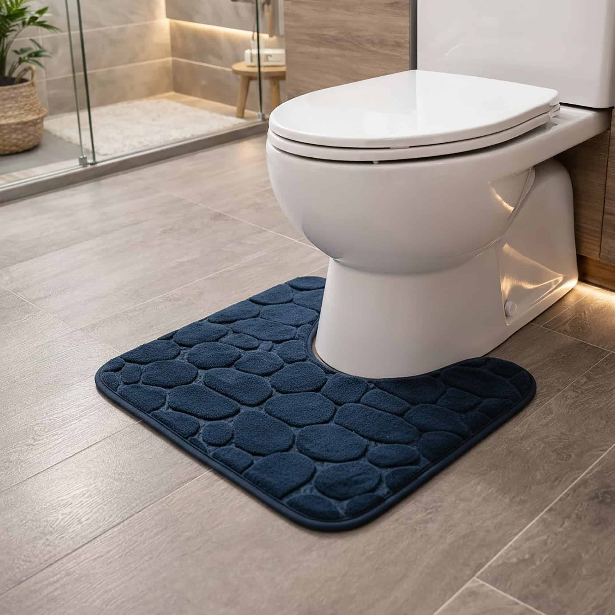 Start your daily routine in comfort with this Ultra-Soft Navy Blue Memory Foam Toilet Rug, designed to fit perfectly around the base of the toilet.