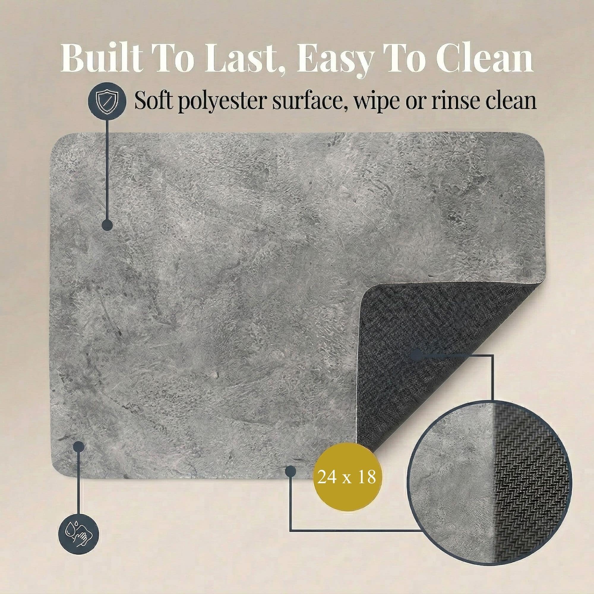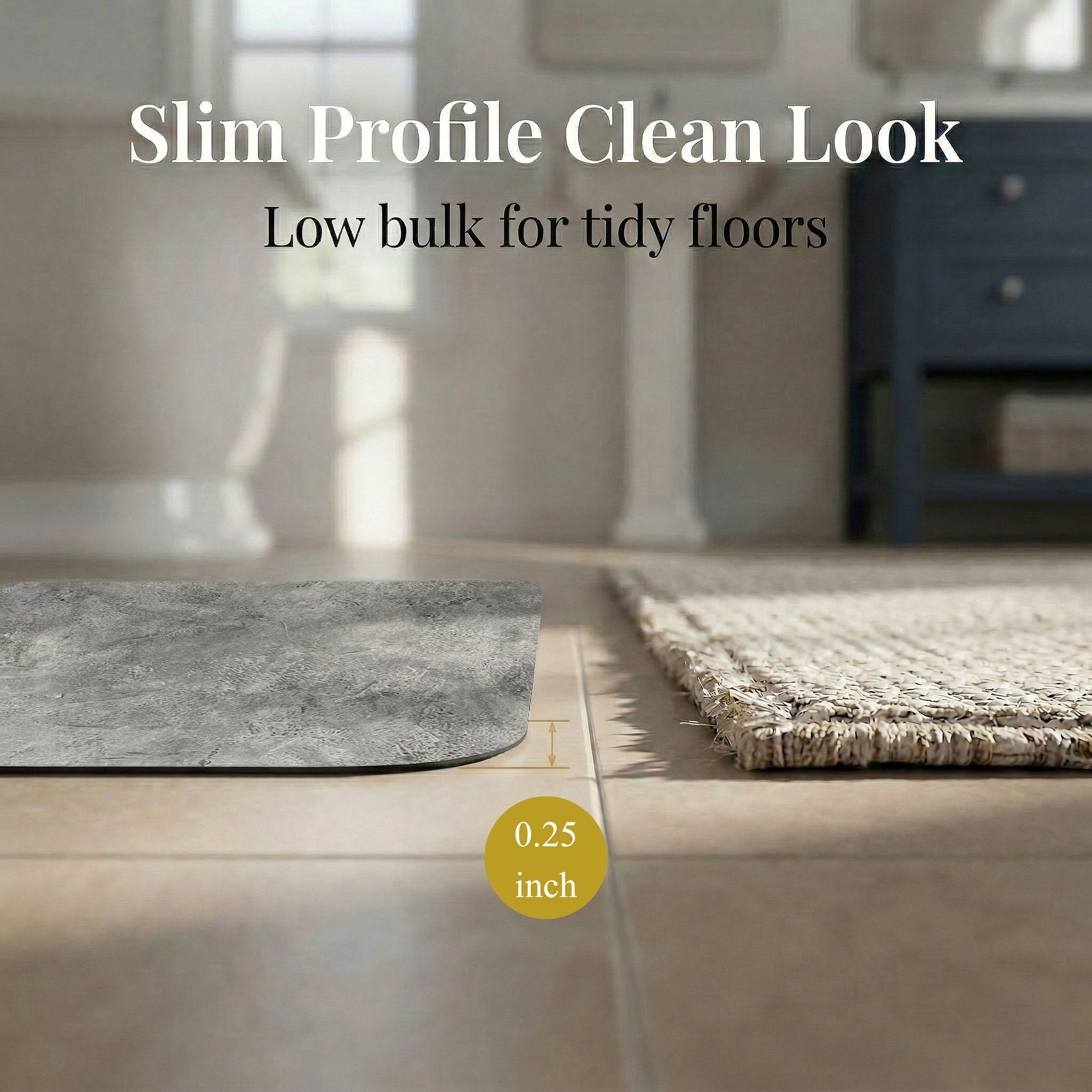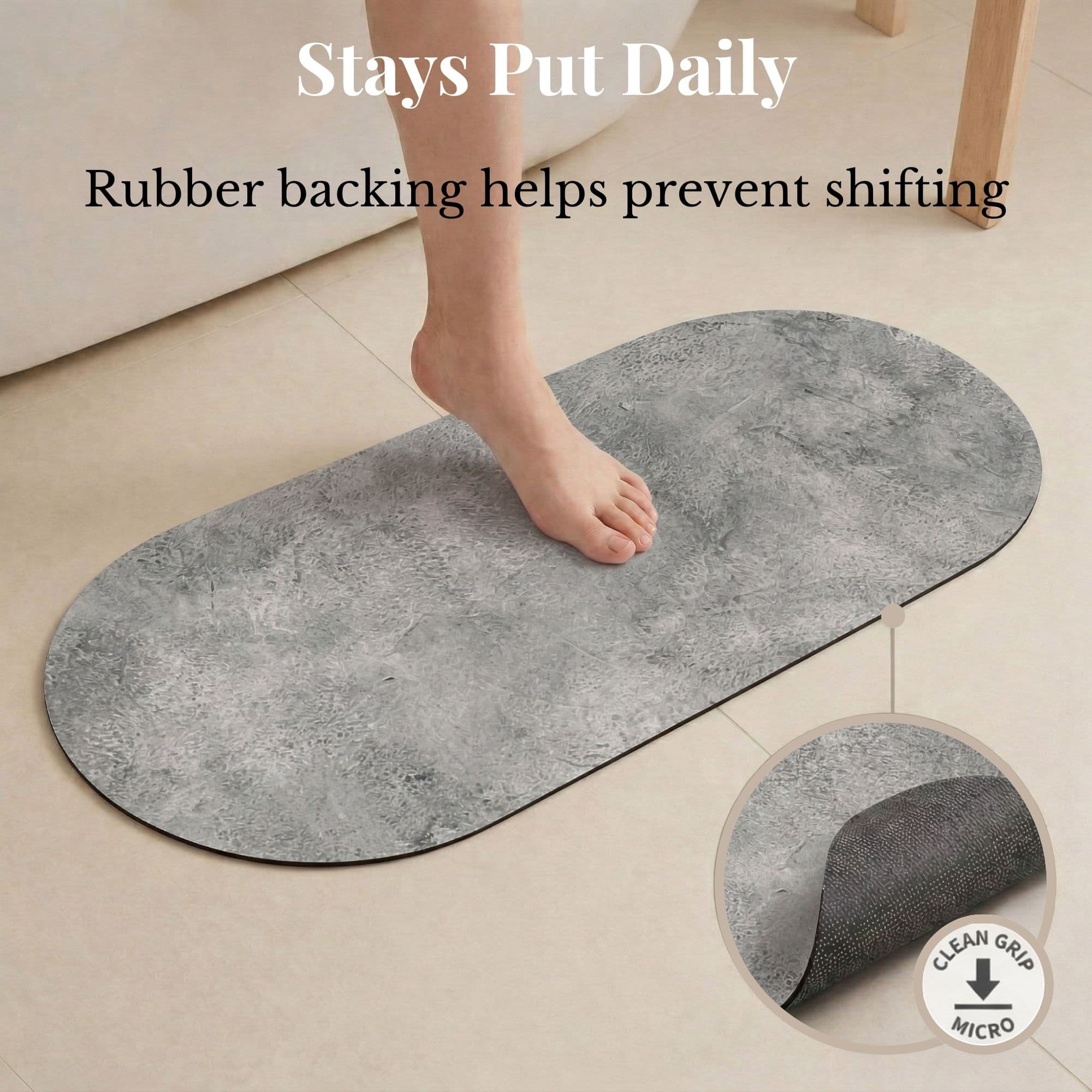 Every mat in the Urban Concrete set shares the same high-performance construction: PU-Coated Polyester for fast absorption, a non-slip rubber backing that grips tile and vinyl, and machine-washable fabric that stays vibrant wash after wash.