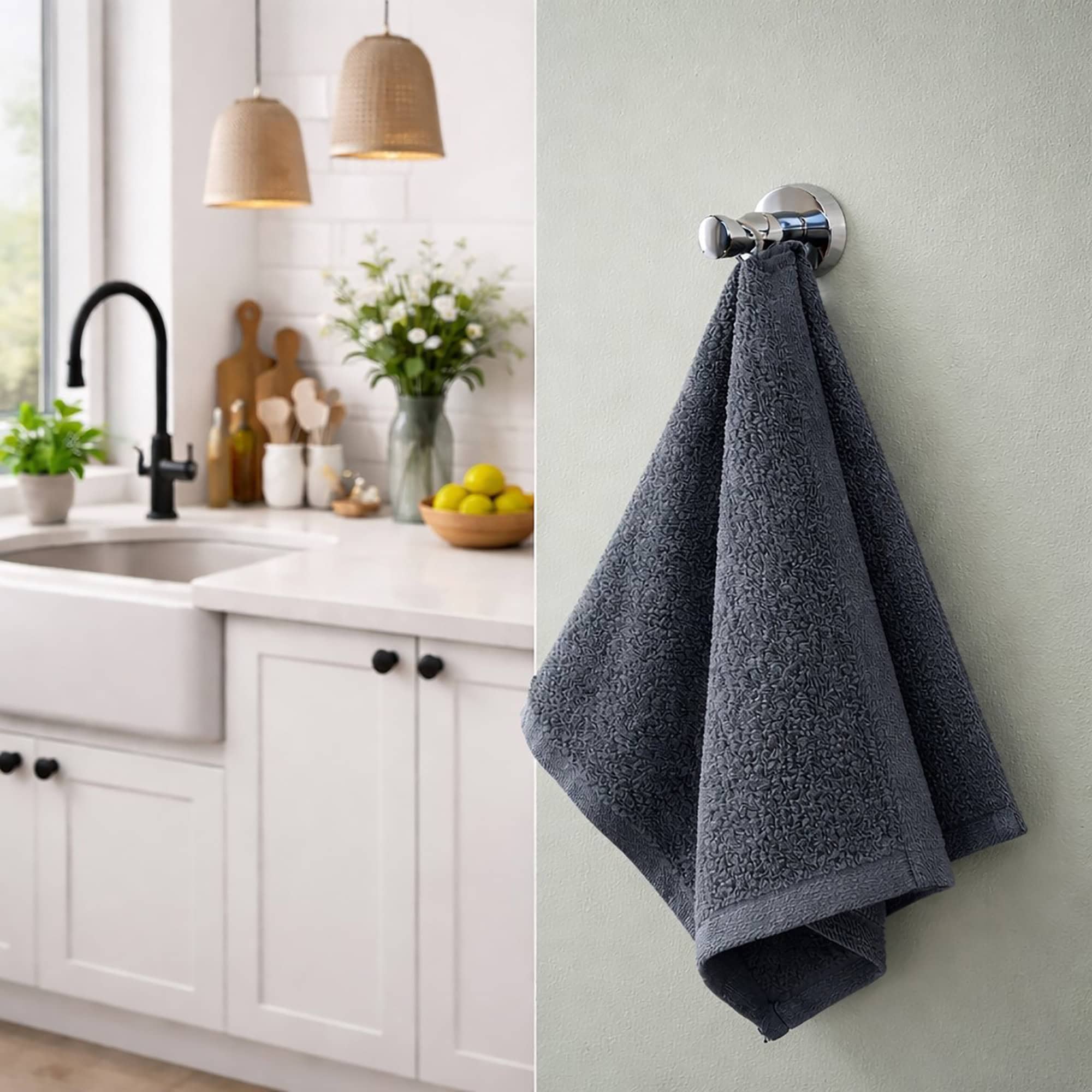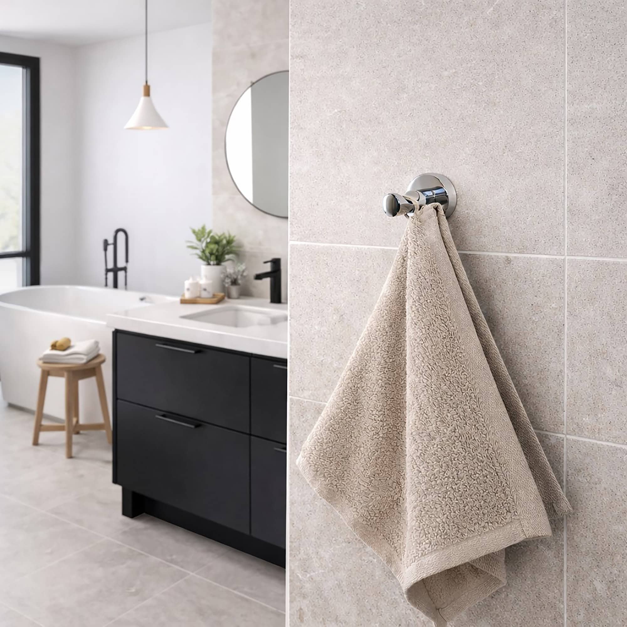 Ideal for bathrooms, kitchens, and closets, it securely holds towels, robes, coats, and bags while saving space. The sleek, minimalist design adds a modern touch to any room.
