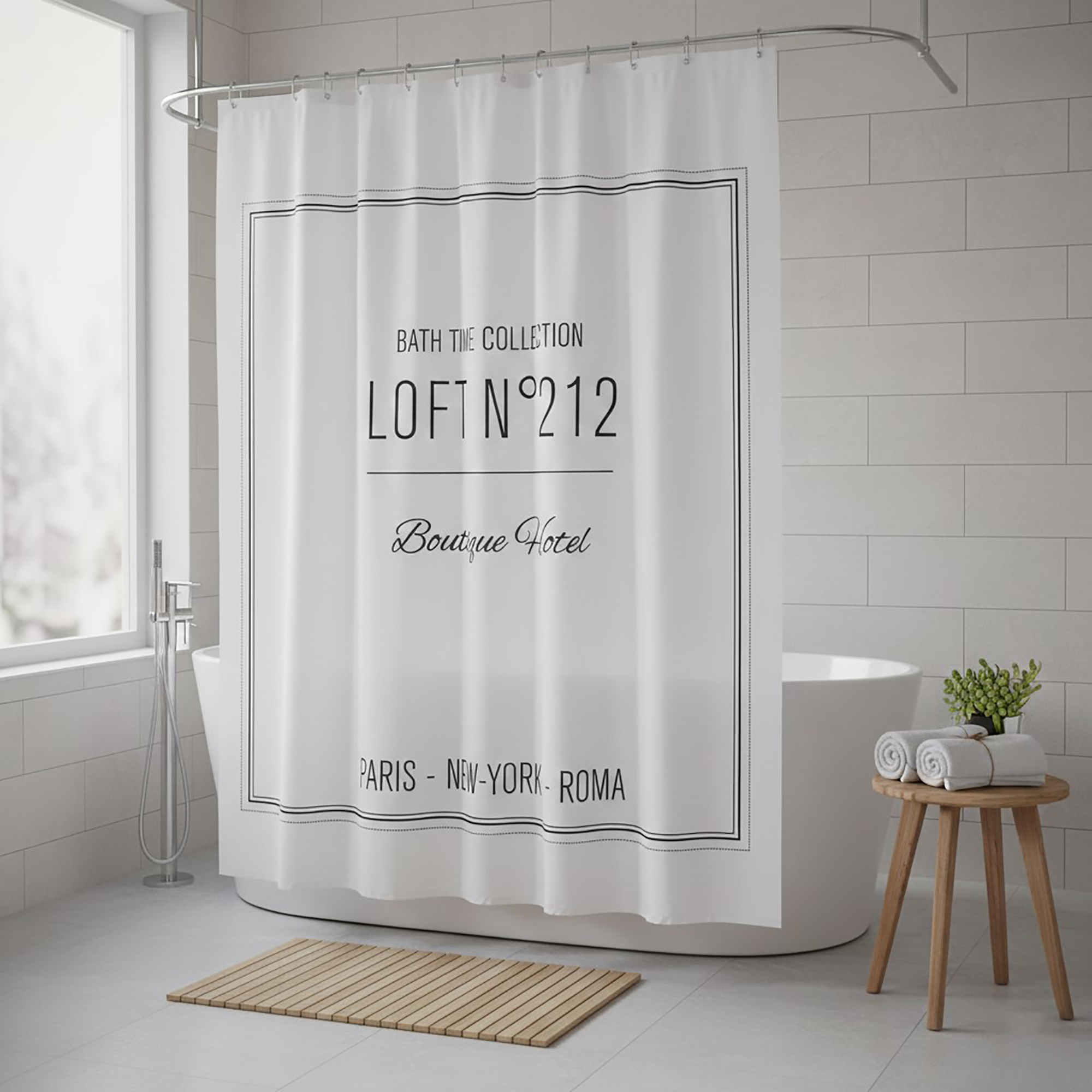 The white background of the curtain is beautifully contrasted with black writing that adds a sleek and modern touch to your bathroom decor. Inspired by luxury hotels, this printed shower curtain is versatile enough to fit any deco.